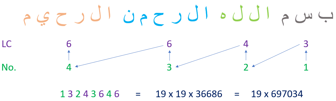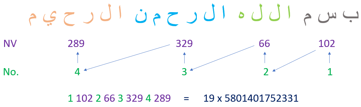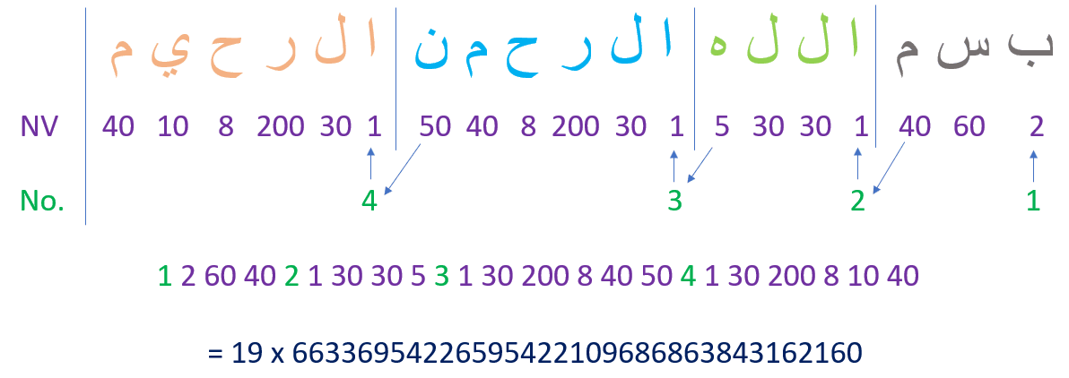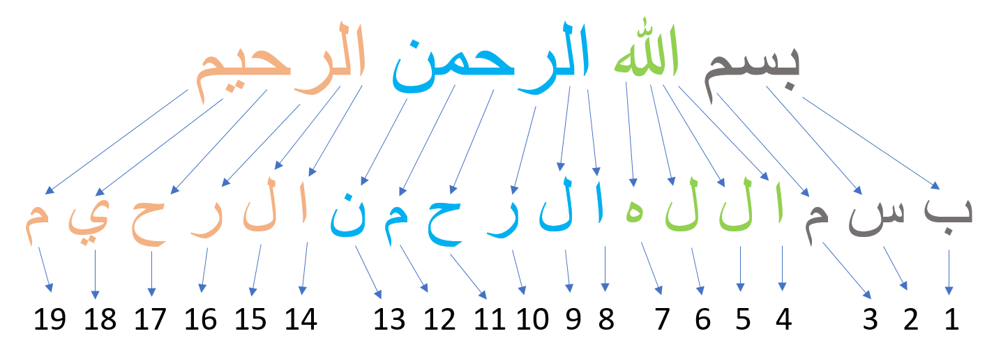 Wenn man die Wörter der Basmala nummeriert und die Anzahl der Buchstaben, die in jedem Wort vorkommen, dahinter schreibt, erhält man eine 8-stellige Zahl, die sich zweimal durch 19 teilen lässt: